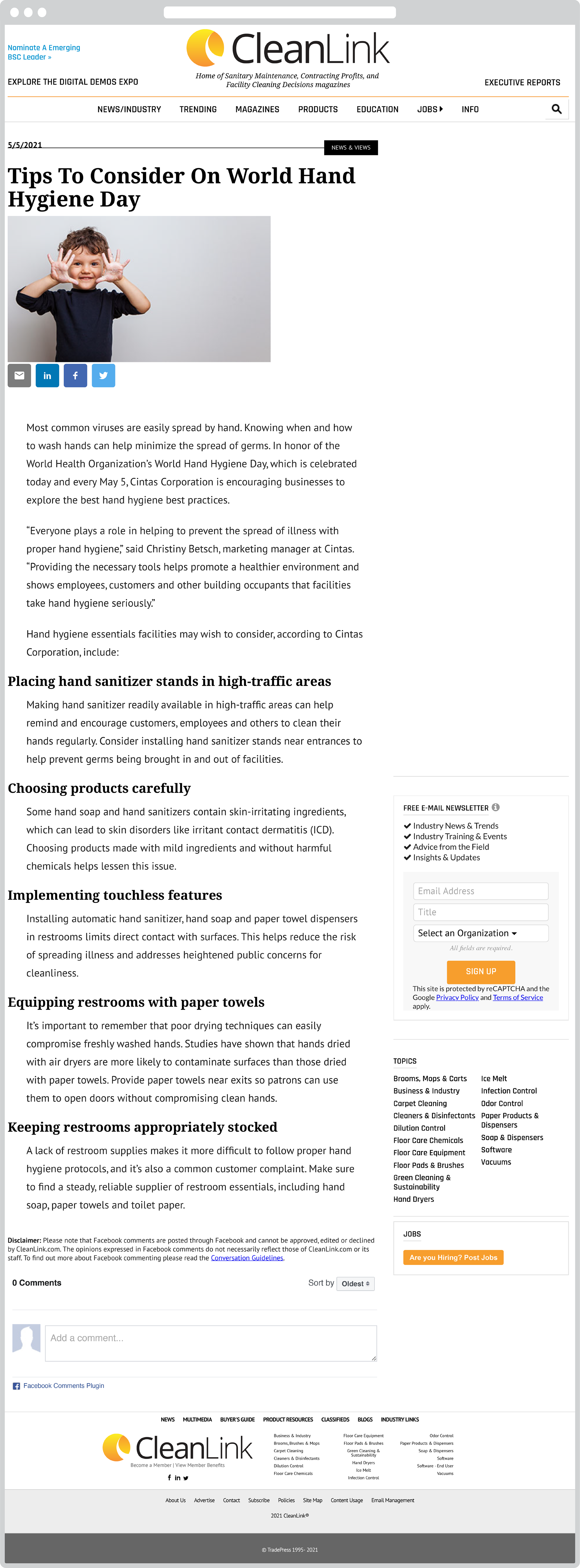 The COVID-19 pandemic shined a brighter spotlight on the cleaning industry and frontline workers than ever before. Consequently, Cintas needed to position itself as a service provider that could remain reliable in chaotic times. To get this message to Cintas’s customers, I leveraged the company’s expertise and humanitarian efforts on social media and trade publications.
